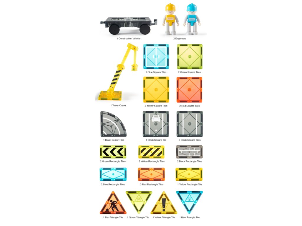36 ks dílků stavebnice - 4 x trojúhelník rovnostranný, 4 x zatáčka 90°, 12 x čtverec, 12 x obdélník, 1 x podvozek s kolečky, 2 x panáček, 1 x otočné rameno jeřábu, návod a sáček na ukládání stavebnice