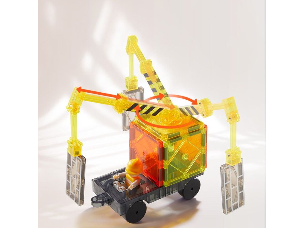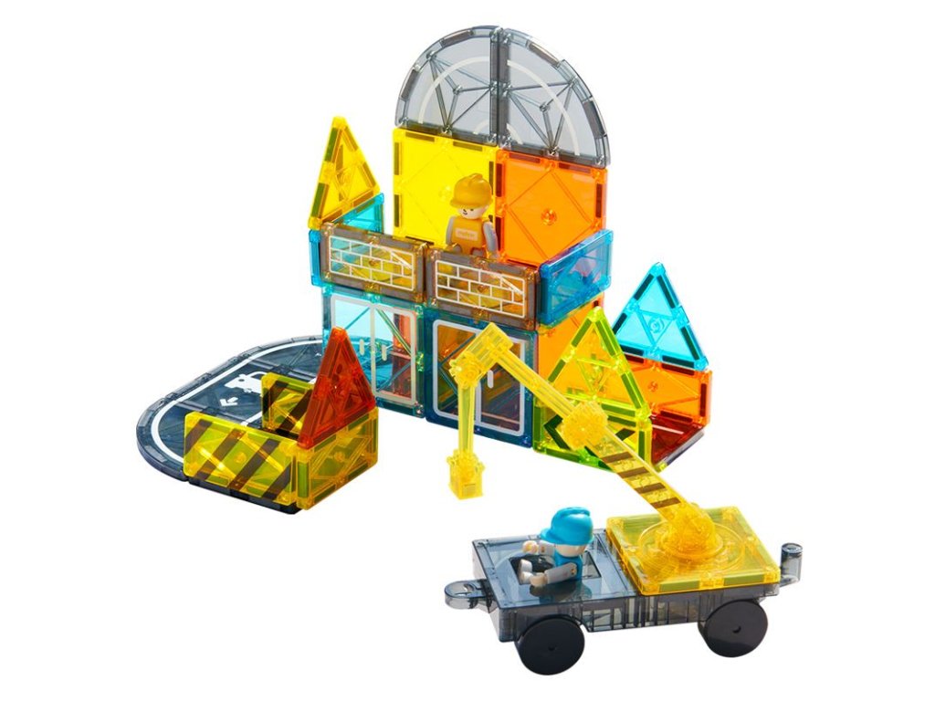 Barevná magnetická stavebnice s motivem stavitele při práci.