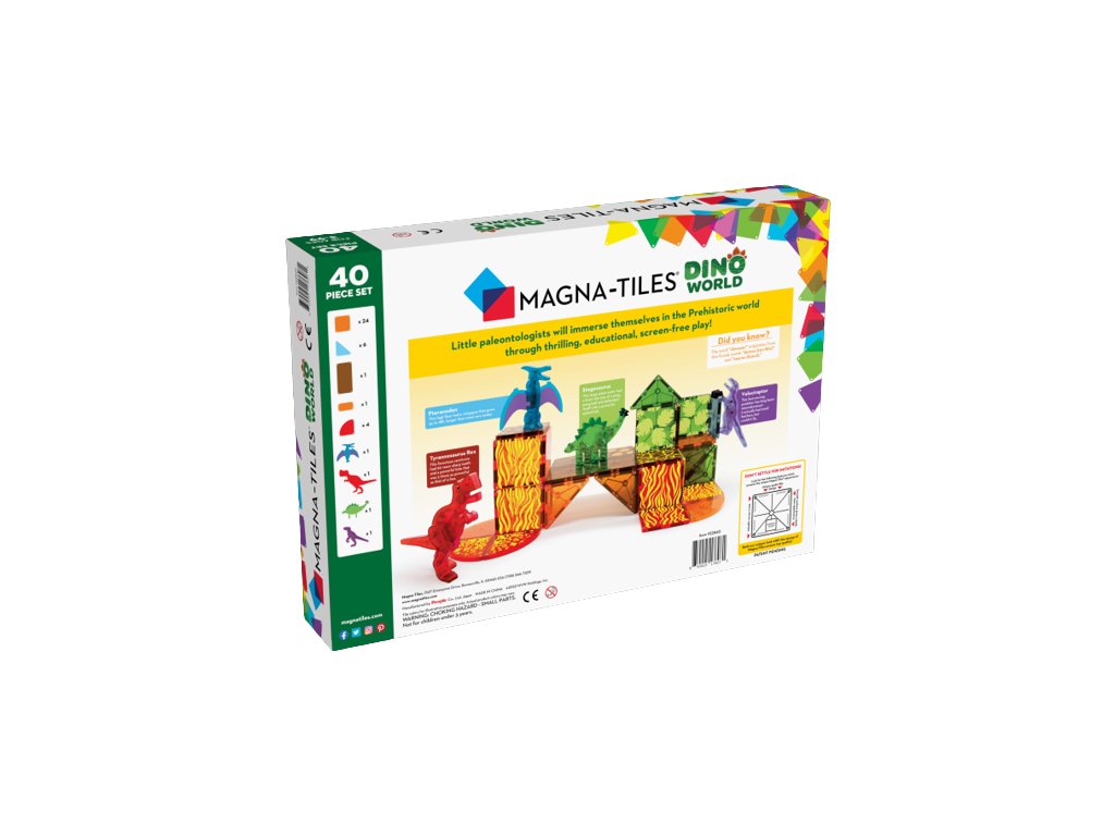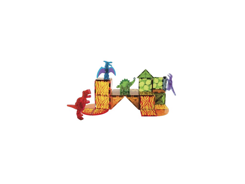 Objevte další dobrodružství v podobě sopečných výbuchů, roztavené lávy a zuřivých dinosaurů v rozšířené kolekci DINO a vzbuďte zvědavost ohledně paleontologie. Tato sada DINO WORLD obsahuje čtyři plně magnetické dinosaury a pestrobarevné dlaždice s vulkanickou tématikou pro herní potenciál, který nikdy nevyhyne. Každý dinosaurus - Pteranodon (modrý), T-Rex (červený), Stegosaurus (zelený) a Velociraptor (fialový) má pohyblivé části připravené pro akci a imaginární hru. Sada obsahuje: 4 figurky dinosaurů, 24 klasických malých čtverců, 6 klasických pravých trojúhelníků, 1 velký obdélník, 1 malý obdélník, 4 čtvrtkruhy. Sada je kompatibilní se všemi sadami Magna-Tiles a je vyrobena z potravinářského materiálu ABS, který neobsahuje BPA, latex ani ftaláty, tudíž jsou díly pro děti zcela bezpečné.