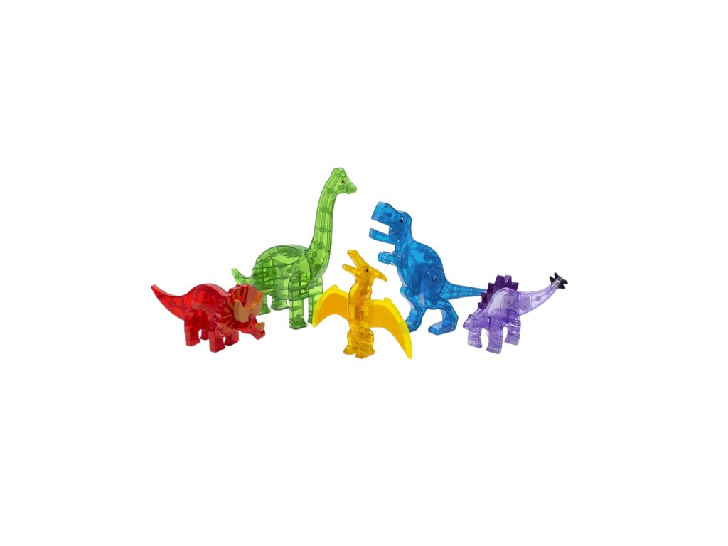 Sada obsahuje pět magnetických dinosaurů - Pteranodon (žlutý), T-Rex (modrý), Stegosaurus (fialový), Triceratops (červený) a Brachiosaurus (zelený). Každý dinosaurus má pohyblivé části připravené pro akci a imaginární hru.